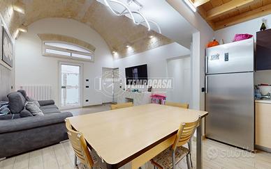 L'ingresso si apre su un ampio soggiorno open space, caratterizzato da una suggestiva volta a botte in tufo e da un soppalco; il cavedio interno di 10 mq, accessibile dalla zona giorno, è uno spazio versatile, ideale per creare un angolo lavanderia.