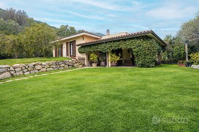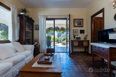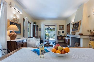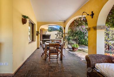 La proprietà si sviluppa all'interno di un lotto di circa 6.000 mq, ricco di macchia mediterranea e posizionato in un contesto panoramico di grande fascino. La villa è disposta interamente su un unico livello e si compone di una luminosa zona giorno con angolo cottura riservato, mentre il soggiorno si affaccia su un ampio loggiato, perfetto per pranzi e cene all'aperto durante la bella stagione.
