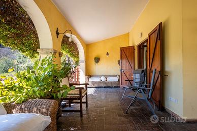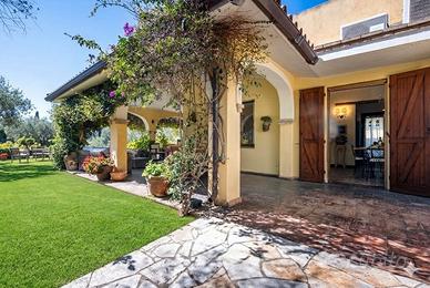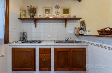 La villa presenta rifiniture rustiche di grande carattere, perfettamente integrate con l'ambiente circostante: pavimenti in cotto, arredi in muratura e in legno massello, e camminamenti in pietra a vista che circondano la casa, contribuendo a creare un'atmosfera armoniosa e accogliente.
