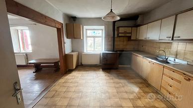 Salorno, in via Molini, proponiamo in vendita porzione di casa da ristrutturare suddivisa in due unità abitative. La casa su più livelli è composta da: piano interrato (piano strada) dove è presente un cortile comune, un ampio deposito utilizzabile come garage, e due cantine convertibili in garage; il piano terreno è costituito da un portico comune ed un ampio appartamento di 140 mq attualmente composto di atrio, cucina, due stanze, bagno , ripostiglio e corridoio; il piano primo è costituito da ampio appartamento di 140 mq attualmente composto di atrio, cucina, due stanze, bagno , ripostiglio, corridoio e balcone; il piano sottotetto, collegato al piano primo, è costituito da ampia soffitta al grezzo con generosa altezza per superficie pari agli appartamenti sottostanti.