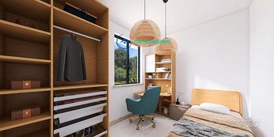 Il primo piano ospita la zona notte, anch'essa suddivisa in tre unità simmetriche, ciascuna con: camera matrimoniale, camera singola, bagno e ripostiglio. Le finiture sono modificabili a piacimento, doppi muri per maggiore insonorizzazione e coibentazione, impianto termico totalmente elettrico con disposizione di quattro o più termoconvettori ad unità abitativa, fotovoltaico da 3 kw e batteria di accumulo, infissi in alluminio finitura legno di ultima generazione. Classe energetica A4