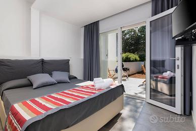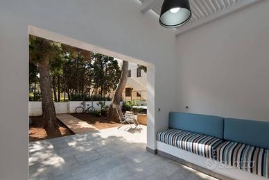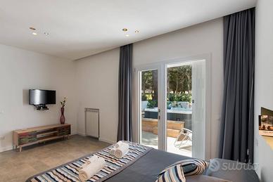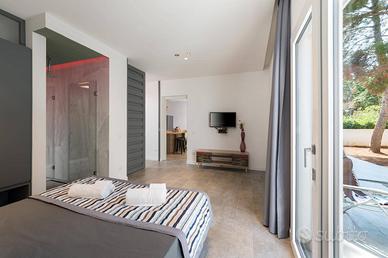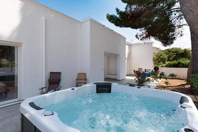 La villa si estende all'esterno con ulteriori 85 mq circa, pensati per offrire il massimo relax. Un'ampia zona solarium con sdraio invita a godersi il sole siciliano, mentre una loggia coperta con divano in muratura è perfetta per rilassarsi all'ombra. Lo spazio include anche una zona dedicata a cene estive sotto le stelle, con tavolo per pranzi o serate in compagnia. È inoltre presente una vasca idromassaggio con cromoterapia e filodiffusione audio, perfetta per rigenerarsi dopo una giornata in spiaggia. L'esterno è completato da una doccia esterna e da zone verdi curate con piante ornamentali, che creano un'atmosfera accogliente e fresca.