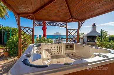 Rif: 179 (191245052) - Santa Margherita di Pula, nei pressi del Forte Village, nel contesto più suggestivo, proponiamo una splendida villa fronte mare disposta su due livelli, in una posizione unica e irripetibile. Il primo livello è composto da un ampio salone di 60 mq con camino, una cucina, due camere da letto e bagno. Una scala esterna conduce al primo piano, composto da soggiorno con terrazza sul mare di 40 mq, un'altra cucina, due camere da letto e bagno. E' presente un giardino che da su 4 lati, jacuzzi, barbecue, solarium e rimessaggio con accesso diretto alla spiaggia, zona parcheggio coperta. L'architettura è molto elegante, le rifiniture sono tipiche degli anni 70, molto curate e con qualche ammodernamento. - Classe: NC