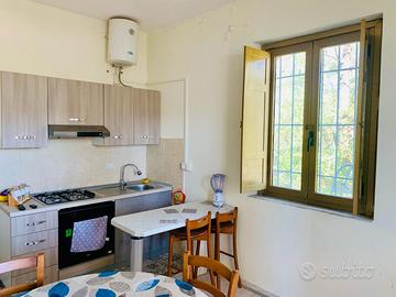 Casa indipendente a Sellia Marina in località Sena, vicino al mare. Composta da cucina soggiorno, due camere da letto, ripostiglio, bagno, veranda coperta e un ampio giardino privato (370 m) con docce esterne. Completamente arredato.
