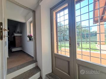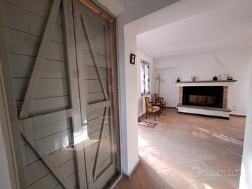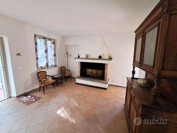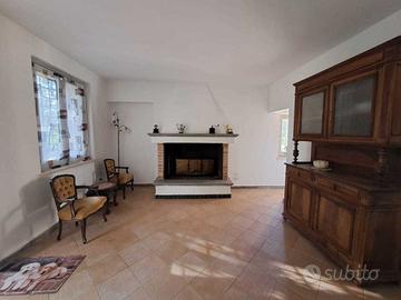 Piano terra rialzato: l'ingresso si apre su un'accogliente zona giorno composta da sala da pranzo con camino, cucina abitabile, soggiorno con travi a vista e un pratico bagno di servizio.