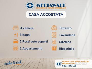 (Riferimento: BQ-109-RV) Vivaro (Rif. BQ-109-RV) In posizione centrale, a due passi da tutti i principali servizi, proponiamo in vendita casa accostata attualmente composta da due appartamenti indipendenti (uno al piano terra ed uno al piano primo) con ampio giardino comune, ristrutturata nel 1980, riscaldamento a gas metano (caldaia nuova). L'abitazione di complessivi circa 330 mq è così suddivisa: al piano TERRA (80 mq circa), con ingresso indipendente, miniappartamento composto da ingresso, zona giorno con cucina open space, disimpegno, ampia camera matrimoniale ed un bagno finestrato. Al piano PRIMO e SECONDO: appartamento di circa 250 mq di ampie metrature, con stufe a pellet che integrano il riscaldamento a termosifoni presente, doppio split al primo ed al secondo piano a pompa di calore, composto da: ingresso, soggiorno spazioso e munito di caminetto, cucina separata abitabile, disimpegno, due camera matrimoniali ed un bagno finestrato con vasca; salendo una scala in legno dalla zona soggiorno si accede al secondo piano in cui troviamo un'ampia sala versatile ottima anche come studio, un ripostiglio, una camera matrimoniale ed un bagno finestrato con doccia. Accessoriata al piano terra da giardino, doppio posto auto coperto, lavanderia, centrale termica, ripostiglio e deposito. NON PERDERE 'OCCASIONE!! PREZZO TRATTABILE!