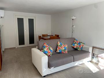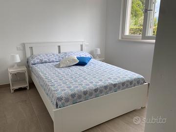 Immersa nel verde circa a un chilometro dal mare porzione villetta singola indipendente, composta da ampio soggiorno, cucina accessoriata di microonde, forno, macchinetta a cialde per il caffè, lavastoviglie e lavatrice; due camere matrimoniali , due bagni, ampio giardino con terrazza coperta e barbecue.Posto macchina esterno riservato, sono a disposizione due biciclette.Non sono ammessi amici a quattro zampe .