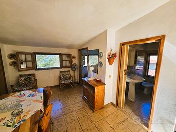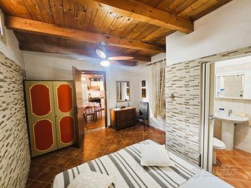 Al primo piano, una mansarda luminosa ospita una camera, un soggiorno con cucinino, bagno e un loggiato panoramico da cui ammirare le colline circostanti.