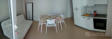 Area scoperta attrezzata, soggiorno pranzo con angolo cottura e divano letto, bagno, una stanze da letto matrimoniale e cabina armadio;