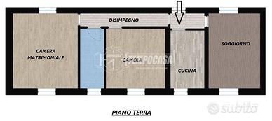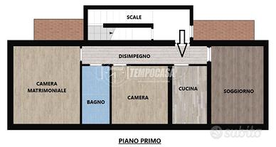 Il piano terra è composto da: ingresso nel disimpegno, ampio soggiorno, cucina abitabile, bagno finestrato con vasca, camera e camera matrimoniale; il primo piano è composto da: ingresso nel disimpegno, ampio soggiorno con uscita sul balcone, cucina abitabile, bagno finestrato con vasca, camera e camera matrimoniale con uscita su un ulteriore balcone.