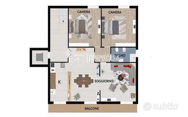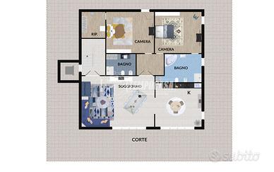 PIANO TERRA di 98mq: ingresso, ampio soggiorno e cucina con uscita su corte, due bagni di cui uno finestrato, due camere da letto e un comodo ripostiglio.