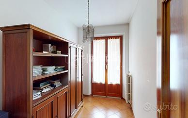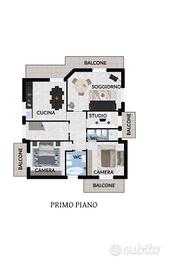 ingresso, ampio soggiorno e cucina abitabile con uscita sul balcone, comodo studio con uscita sul balcone, corridoio notte, bagno finestrato con vasca e due camere matrimoniali con uscita sul balcone, di cui una con bagno ensuite.