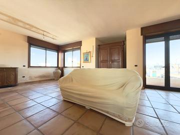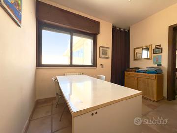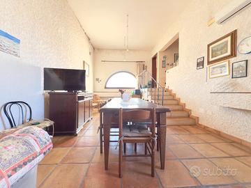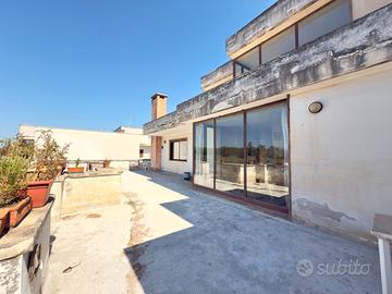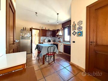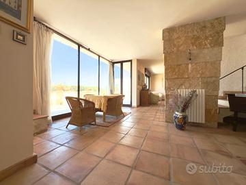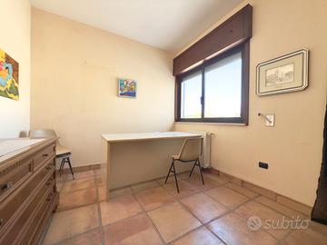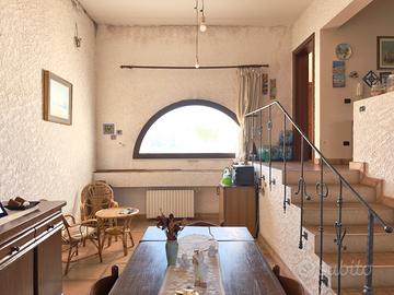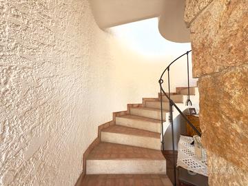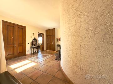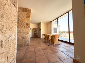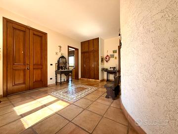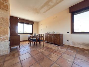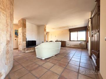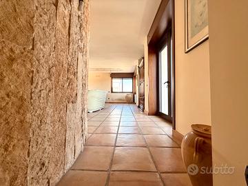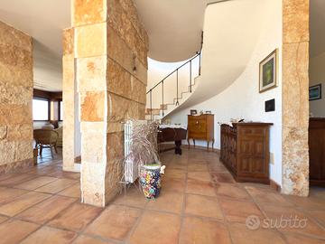 L'ingresso all'abitazione, spazioso, permette di raggiungere un enorme salone, la cui estrema luminosità è data da una vetrata di grandi dimensioni, e su cui insiste una caratteristica scala a chiocciola, funzionale, che porta al piano superiore, su cui troviamo un ulteriore salone. Al piano primo, troviamo anche una cucina abitabile, da cui si accede ad un vano lavanderia e un comodo ripostiglio, un bagno, finestrato, e, sottoposto, un ulteriore salone, adibito a sala pranzo, con camino, oltre ad uno studio.
