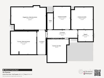 PIANO TERRA: Soggiorno (30,98 m²) con accesso al balcone; Cucina (22 m²); Camera Matrimoniale (14,3m²) con annesso un ripostiglio (1,24m²); Camera Matrimoniale (17,9 m²); Camera Matrimoniale (19,82 m²) con accesso al balcone; Bagno (6,3 m²).