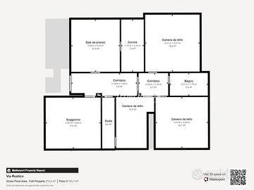 Ingresso (7,32 M²); Soggiorno (16,26 M²); Sala da pranzo (14,6 M²) con accesso al balcone; Cucina (6,81 M²); Camera (11,01 M²); Disimpegno (3,63 M²); Camera Matrimoniale (18,13 M²); Camera Matrimoniale (15,42 M²); Bagno (4,76 M²).