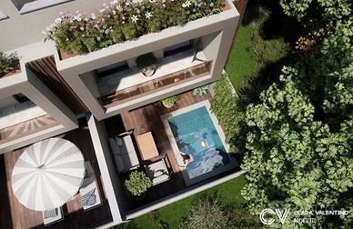Il livello superiore ospita un vano tecnico adibito a lavanderia e due ampi terrazzi, perfetti per creare un'area solarium o un angolo relax.