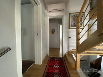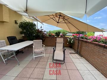 Un terrazzo di circa 30 mq ci accoglie all'ingresso dove troviamo un grande soggiorno, una cucina separata, una camera singola, due camere doppie e un grande bagno. Salendo le scale arriviamo in una zona abitabile dove si trova un secondo bagno, uno studio e alcuni vani uso ripostiglio.