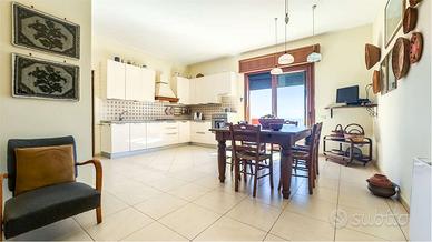 Gli ambienti interni si articolano in un elegante ingresso, servito da scala di collegamento al piano superiore, un luminoso soggiorno con ampia vetrata scorrevole, una cucina abitabile anchessa con vetrata vista mare, arricchita da dispensa e collegata a una pratica lavanderia. Un disimpegno conduce alla zona notte, rifinita con raffinato parquet in Iroko e composta da tre camere da letto, di cui una matrimoniale con bagno privato, una doppia e una singola, servite da un secondo bagno con doccia.
