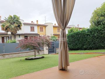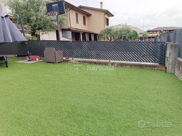 L'esterno della villa è circondato da un ampio giardino, sia sul fronte che sul retro, perfetto per soddisfare ogni esigenza di vita all'aperto e di relax in famiglia.