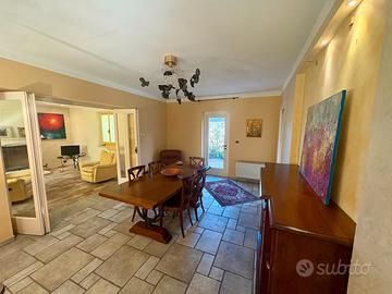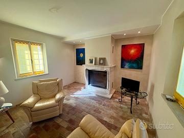 Al piano terra si sviluppa una luminosa zona giorno con ambienti ampi e accoglienti: un soggiorno dominato da un grande caminetto in marmo, vero fulcro vitale della casa, e una zona pranzo che si apre sul giardino grazie ad ampie vetrate che lasciano entrare la luce naturale. Sullo stesso piano trovano spazio una cucina, locali di servizio e due bagni. I pavimenti di questa zona sono in cotto e pietra, in perfetta armonia con lo stile rustico e autentico dell'immobile.