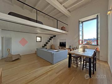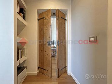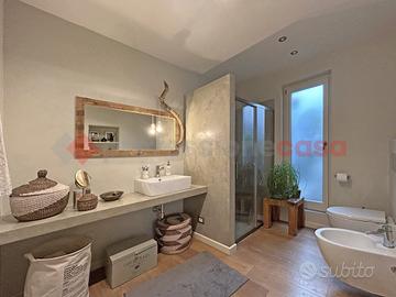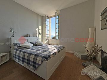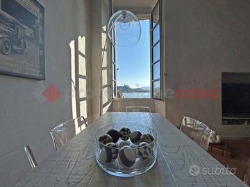 Al piano primo troviamo un ampio appartamento totalmente ristrutturato di circa 218 mq, composto da ingresso, soggiorno e cucina abitabile entrambi fronte lago, tre camere matrimoniali, di cui una con cabina armadio ed una con soppalco e vista lago, tre bagni e cortiletto interno su cui affaccia la cucina ed il corridoio nel quale si trova un bellissimo arco in mattoni pieni originale. L'appartamento ha il pavimento in parquet in rovere oliato in tutti i locali ed è possibile dividerlo in due appartamenti distinti.