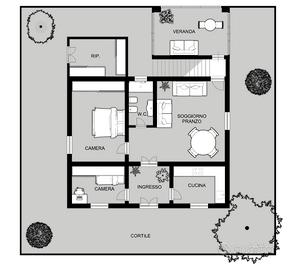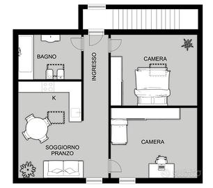 L'ingresso conduce a un ampio salone luminoso, affiancato dalla cucina. La zona notte è composta da due camere da letto, una matrimoniale ed una singola, un bagno finestrato con doccia. Il piano è servito da due ingressi distinti, offrendo versatilità d'uso e massima indipendenza.
