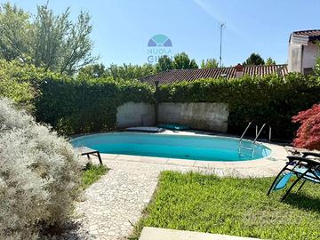 Completano la proprietà l'ampio giardino su tre lati, il portico e la piscina con zona relax.