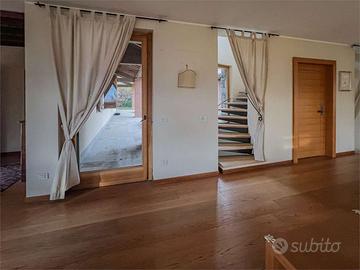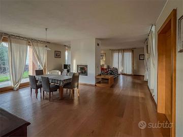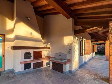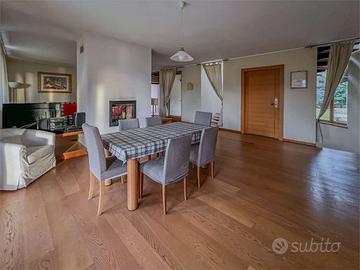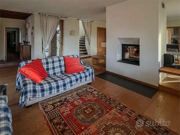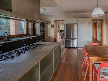 Splendida proprietà in vendita a Ranco, immersa in parco e vigna privata con spettacolare vista panoramica del Lago Maggiore. La villa è disposta su tre livelli per un totale di circa 500 metri quadrati. All'interno è composta da: al piano terra, il corpo principale della proprietà, ingresso, un luminoso soggiorno con sala da pranzo e camino bifacciale, condiviso dai due ambienti e una spaziosa cucina abitale, arredata con pregio con affaccio sul giardino e con una vista a 180° del Lago Maggiore. In una delle due ale della villa è presente una zona notte composta da un locale stireria/cabina armadio, un ampio bagno con doppio lavabo, vasca da bagno e doccia e una camera matrimoniale con accesso esterno diretto. Tramite unelegante scala in legno elicoidale, o tramite lascensore interno, è possibile raggiungere il primo piano mansardato della villa. Questo piano è composto da un ampio locale unico, ideale per realizzare una sala hobby e studio, una palestra o un salotto, con accesso sul balcone con vista sul lago; completa il piano una camera da letto matrimoniale con bagno en suite. Al piano seminterrato troviamo una taverna, un locale cantina, un locale lavanderia, il locale, tecnico e un box auto. Nella maggior parte degli ambienti della villa i pavimenti sono i parquet e gli infissi in legno di rovere spazzolato. Gli ambienti della proprietà sono accomunati da ampie vetrate che irradiano gli ambienti, complice lottima esposizione solare dellimmobile, e donano a molti tra essi una splendida vista del Lago Maggiore.