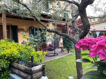 Il giardino di circa 60 mq è dotato di una nuova ed attrezzata zona barbecue, di un pergolato in legno con pavimentazione sottostante e, di recente installazione, impianto d'irrigazione, impianto goccia a goccia e SISTEMA ANTIZANZARE IZANZ perimetrale.