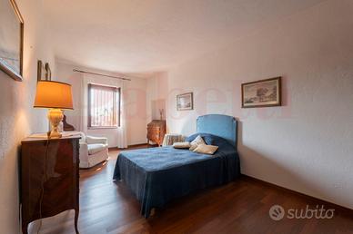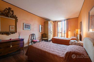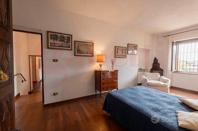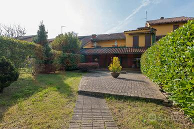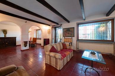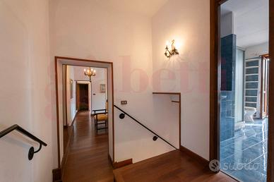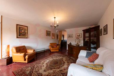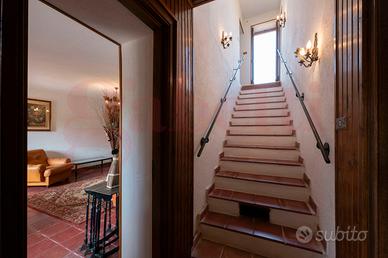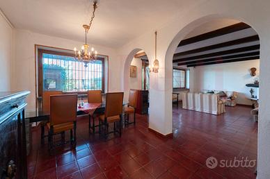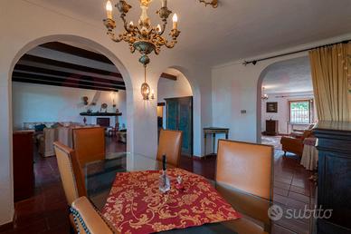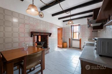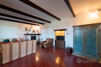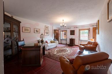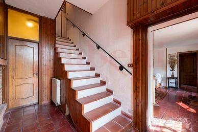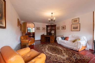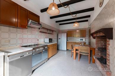 - piano terreno: cucina abitabile con caminetto, soggiorno, ampio salone con camino, da quest'ultimo accesso al portico ed al giardino retrostanti la proprietà; infine ripostiglio e locale ad uso cantina.