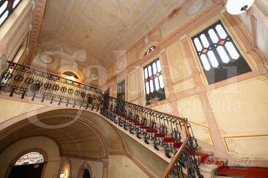 Una scenografica scala monumentale, impreziosita da altorilievi, pitture e ringhiere artistiche in ferro battuto