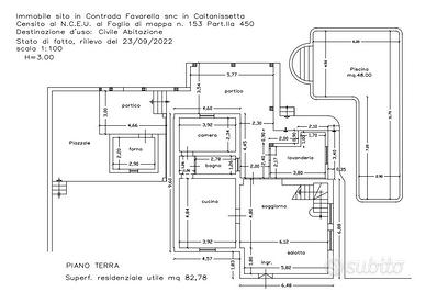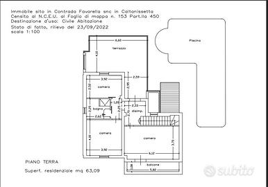 Diritto di piena proprietà su fabbricato unifamiliare per civile abitazione ubicato in Caltanissetta (CL), c. da Favarella snc, censito al Catasto fabbricati del Comune di Caltanissetta, al foglio 153, part. 450, cat. A/7, classe 2, vani 8, Piano T-1, rendita ? 557,77, classe energetica G, superfice catastale complessiva mq 138eterreno pertinenziale censito al Catasto terreni del Comune di Caltanissetta, foglio 153, particella 450 di ha 0.08. 70, area di ente urbano. Giusta relazione estimativa in atti, il bene venduto si sviluppa su due piani e consta, al piano terra, di tre vani (uno dei quali con accesso diretto ad un portico coperto ove sono allocati due ulteriori vani accessori, vano lavanderia e vano per forno) oltre accessori; al piano primo, di tre vani più accessori oltre terrazzo e balcone. L'immobile è dotato di una piscina della superficie di mq 48,00, realizzata in assenza di titoli abilitativi edilizi. Il tutto cosi? come meglio descritto nella relazione dell'esperto stimatore alla quale integralmente si rinvia.