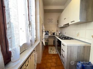 Al primo piano entrando troviamo subito un corridoio che divide le due unità, dal lato destro troviamo un bilocale con un'ampia e confortevole zona giorno, una cucina separata, una camera matrimoniale finestrata, e un bagno comodo con doccia.