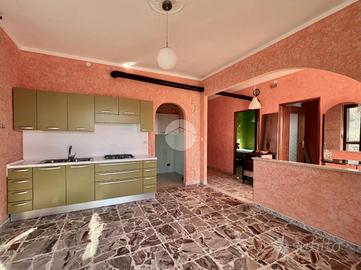 Al piano terreno si trova il primo appartamento, composto da un disimpegno che conduce alla zona giorno, dove la cucina è stata inserita in un secondo momento; il tinello originario è attualmente utilizzabile come ripostiglio.