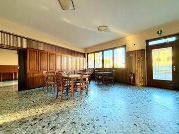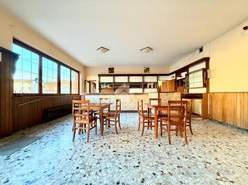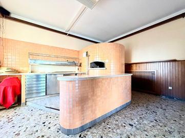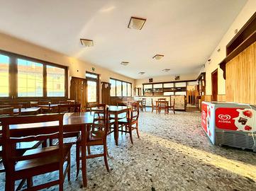 L'ingresso conduce a un ampio atrio di circa 75 mq, dove trovano spazio il bancone reception e una confortevole area dedicata all'attesa e all'accoglienza dei clienti. Da qui si accede alla sala principale, collegata da un lato a una sala giochi e dall'altro a una sala da pranzo di circa 75 mq, arricchita da una suggestiva zona pizza con forno a legna in muratura, ideale per creare un ambiente caldo e conviviale.