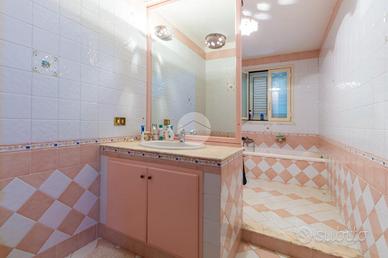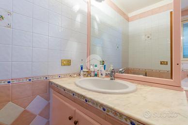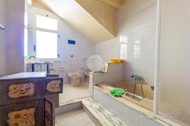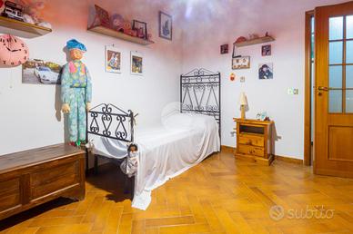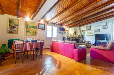 Dalla scala esterna laterale si accede all'appartamento del piano di sopra di 100mq. All'ingresso troviamo l'ampia zona living, definita da un soggiorno doppio con camino e dalla cucina in muratura; una porta a scrigno separa i due ambienti. Adiacente alla cucina, vi è un terrazzo di 24mq che permette di godere di un'ulteriore zona relax. Al fianco della zona giorno vi è la camera da letto con bagno padronale, una cameretta, uno studio e un ulteriore bagno con vasca e ripostiglio. La pavimentazione è in ceramica effetto parquet e l'ambiente è arricchito dalle travi a vista. La presenza di finestre in tutte le camere garantisce luminosità nei vari ambienti; gli infissi sono alluminio e vetrocamera, le porte interne sono in legno e vetro satinato. Gli impianti, idrico ed elettrico, seppur in buono stato, sono da adeguare alle norme vigenti. L'appartamento si presenta in buono stato e abitabile sin da subito.