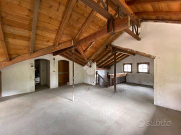 e il collegamento al piano superiore tramite maestosa e singolare scala in legno massello dove troviamo la cucina abitabile con penisola a vista su sala da pranzo e soggiorno con camino e accesso al balcone, 1 camera utile, il bagno e la scala che conduce alla mansarda composta da una grande camera utile, bagno e locale tecnico.