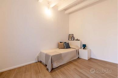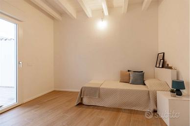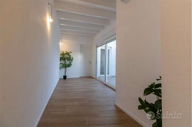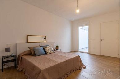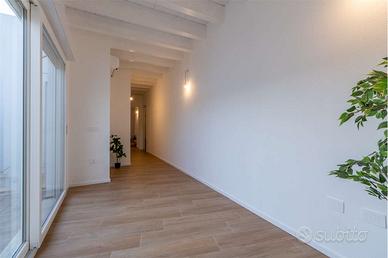 Lingresso si apre su unampia e luminosa zona living con cucina a vista, pensata per offrire la massima convivialità. Un funzionale disimpegno conduce alla zona notte, composta da una camera singola e una spaziosa camera matrimoniale dotata di bagno padronale con generoso piatto doccia. Tutti gli ambienti della zona notte e il disimpegno godono di accesso diretto al cortile privato tramite porte-finestre, garantendo unottima continuità tra interni ed esterni.