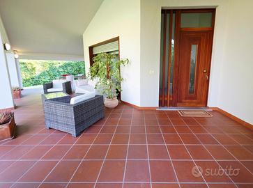 La villa ha un accesso pedonale indipendente ed attraverso un vialetto in pietra si giunge all'abitazione, leggermente rialzata rispetto al piano strada, dove veniamo accolti da un patio di 60 mq. La porta d'ingresso si apre direttamente sulla zona living che offre ambienti separati, ma in armoniosa continuità. Dal soggiorno dotato di caminetto mediante un'apertura ad arco si accede alla sala da pranzo caratterizzata da un'ampia vetrata che ci consente di godere di una splendida vista sul giardino. Aprendo le due porte scorrevoli ci viene svelata la cucina separata dotata di terrazza e comodo ripostiglio. Una scala completamente rivestita in legno ci consente di accedere alla zona notte che ospita tre camere, di cui una matrimoniale di 19 mq con bagno padronale e terrazza abitabile, mentre le restanti due sono servite da un ampio bagno con vasca idromassaggio angolare e terrazza.