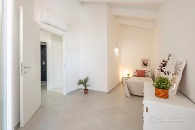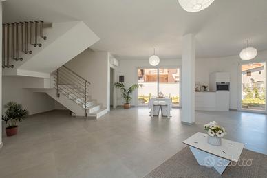 In una delle zone più riservate di Capoterra, all'interno della lottizzazione "Le Querce", proponiamo in vendita una villetta a schiera quadrivano centrale angolata, disposta su due livelli e caratterizzata da un'ottima esposizione sud-est e ovest, che garantisce grande luminosità durante tutta la giornata. L'abitazione dispone di un ampio giardino sul retro di circa 120 mq con loggiato, ideale per vivere gli spazi esterni, e di un cortile frontale di circa 35 mq con accesso carrabile e pedonale, dove è possibile parcheggiare comodamente l'auto. Al piano terra troviamo una spaziosa zona giorno open space di circa 45 mq, oltre a un bagno di servizio. Il piano superiore ospita la zona notte con camera matrimoniale dotata di bagno privato e balcone, una camera doppia, una singola (con scorcio sul mare) e un secondo bagno. Ottime le dotazioni: tetto in legno con travi a vista laccate bianche, climatizzazione in tutti gli ambienti, scaldacqua a pompa di calore, impianto fotovoltaico da 5 kW e predisposizione per solare termico. L'immobile è appena stato ultimato in ogni sua parte ed è disponibile con consegna immediata. Contattaci per maggiori informazioni o per fissare una visita.