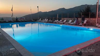All'esterno è presente un giardino pavimentato di circa 80 mq, dotato di box doccia, lavanderia, grande tenda Tempotest installata a luglio 2025, ombrellone, tavolo con sedie, lettini prendisole, tavolo da ping pong e una zona verde con piante e alberi illuminata.
