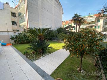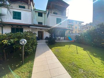 1°Livello: ingresso in ampio salone di rappresentanza con affaccio sul giardino pavimentato del retro dove vi è un ingresso anche secondario, cucina abitabile con accesso su un meraviglioso giardino con vista piscina (condominiale), studio, bagno.