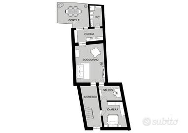 Quattro camere da letto di generose dimensioni, studio, ideale come ambiente per il lavoro, ampio soggiorno, cucina abitabile, funzionale ed accogliente, due bagni, uno per ciascun piano, ben distribuiti e cortile privato, con possibilità di utilizzo come area verde, relax o svago.