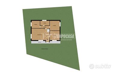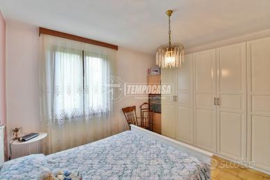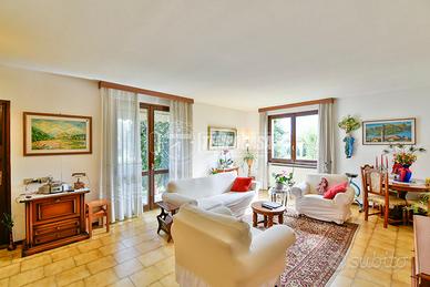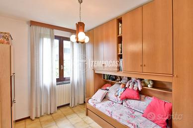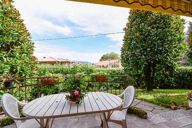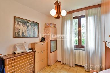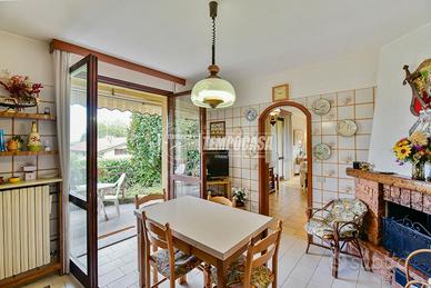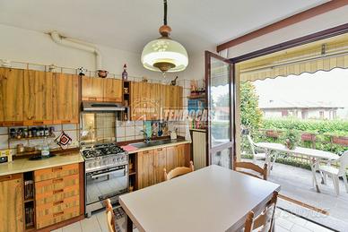 Internamente è in BUONE CONDIZIONI generali e si compone di un trilocale di 121 mq: soggiorno con accesso diretto al giardino, cucina abitabile con portico esterno ideale per mangiare all'aperto, due camere da letto e un bagno finestrato.