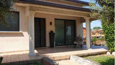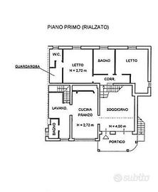 Al piano primo si trovano portico, soggiorno, cucinasala da pranzo, lavanderia, due bagni, corridoio e due camere da letto, di cui una con bagno e guardaroba. Il piano secondo (soppalco) ospita soppalco, ripostiglio e sottotetto con bagno e balcone. Completano il lotto tre garage di ampie dimensioni.