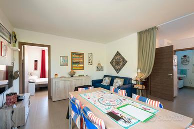 Fantastica occasione! Si vende all'interno di Residence di pregio con piscina semiolimpionica ad uso comune e campo da tennis e calcetto Villa da 160 mq divisa in due comodi appartamenti, con possibilità di riunirli facilmente per formare una Villa unica. Ottima soluzione per investimento, per abitazione privata o per entrambi. Si può affittare una porzione e tenere per sè l'altra. Allo stato attuale ogni unità ha il proprio ingresso, il proprio parcheggio e la propria veranda. La Villa è così composta: - Appartamento al primo piano: Si accede da cancello privato, ampio parcheggio privato, veranda, porta di ingresso e subito ampio ingresso con ripostiglio e porta comunicante con l'appartamento al piano terra. Da qui le scale che portano al primo piano dove si trova un disimpegno con le 4 porte che conducono alle 2 camere matrimoniali, al bagno e alla cucina. - Appartamento al piano terra: anche qui cancello e parcheggio privato, veranda e porta di ingresso. L'appartamento è composto da 1 ampia camera matrimoniale, cucina soggiorno con divano letto, bagno. La Villa è completamente climatizzata, munita di termosifoni, completa di infissi doppio vetro camera e zanzariere. Sistema fotovoltaico da 10kw e solare termico dal valore di circa 50.000,00 Euro. Circa 2.000,00 Euro all'anno di guadagno grazie al fotovoltaico (ritiro dedicato GSE) e bollette ridotte praticamente alle sole tasse. La Villa è già pronta per l'uso, possibilità di vendita con mobili inclusi.