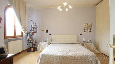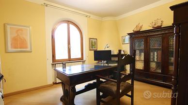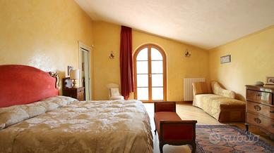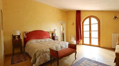 Al primo piano, accessibile sia da scala interna che dall'esterno, si sviluppa una bella e funzionale terrazza panoramica di circa 350 mq, con una bella vista aperta sulla campagna circostante e come ampliamento della zona abitativa che è caratterizzata da un ampio ingresso dal quale si accede un grande e luminoso salone, con attigua la zona notte principale con tre camere da letto, due bagni, uno studio, e una comoda cabina armadio. Il livello superiore, caratterizzato a mansarda, è interamente dedicato alla camera padronale, completa di bagno privato e guardaroba.