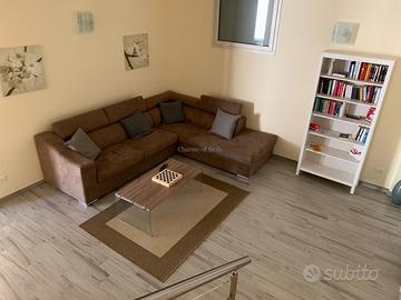 All'interno troviamo ambienti luminosi ed eleganti: il soggiorno spazioso accoglie con arredi moderni e confortevoli; la zona notte dispone di camere matrimoniali arredate con gusto contemporaneo, caratterizzate da pareti personalizzate e illuminazione d'atmosfera. I pavimenti effetto legno donano calore agli spazi mentre le finiture chiare amplificano la luce naturale proveniente dalle numerose finestre.
