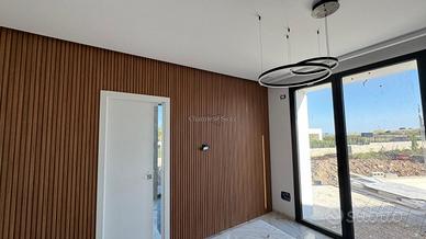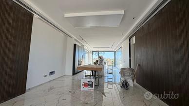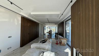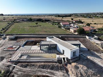 Attualmente in fase di completamento, la villa verrà consegnata finita sia internamente che esternamente, con arredi dal design contemporaneo inclusi. Il concetto architettonico si distingue per le grandi vetrate che permettono alla luce naturale di permeare gli ambienti. L'ingresso accoglie i visitatori in un vasto open space oltre i 100 mq, dove si trovano una luminosa zona living e una cucina/pranzo perfettamente integrate.