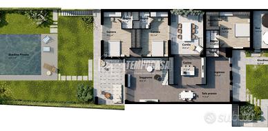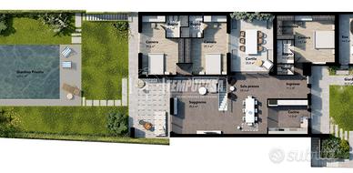 L'esterno non è da meno. Il doppio giardino, sia frontale che sul retro, ti offre la possibilità di trascorrere piacevoli giornate all'aria aperta. E se desideri un tocco di esclusività in più, hai la possibilità di richiedere una piscina interrata per rendere il tuo angolo di paradiso ancora più unico.